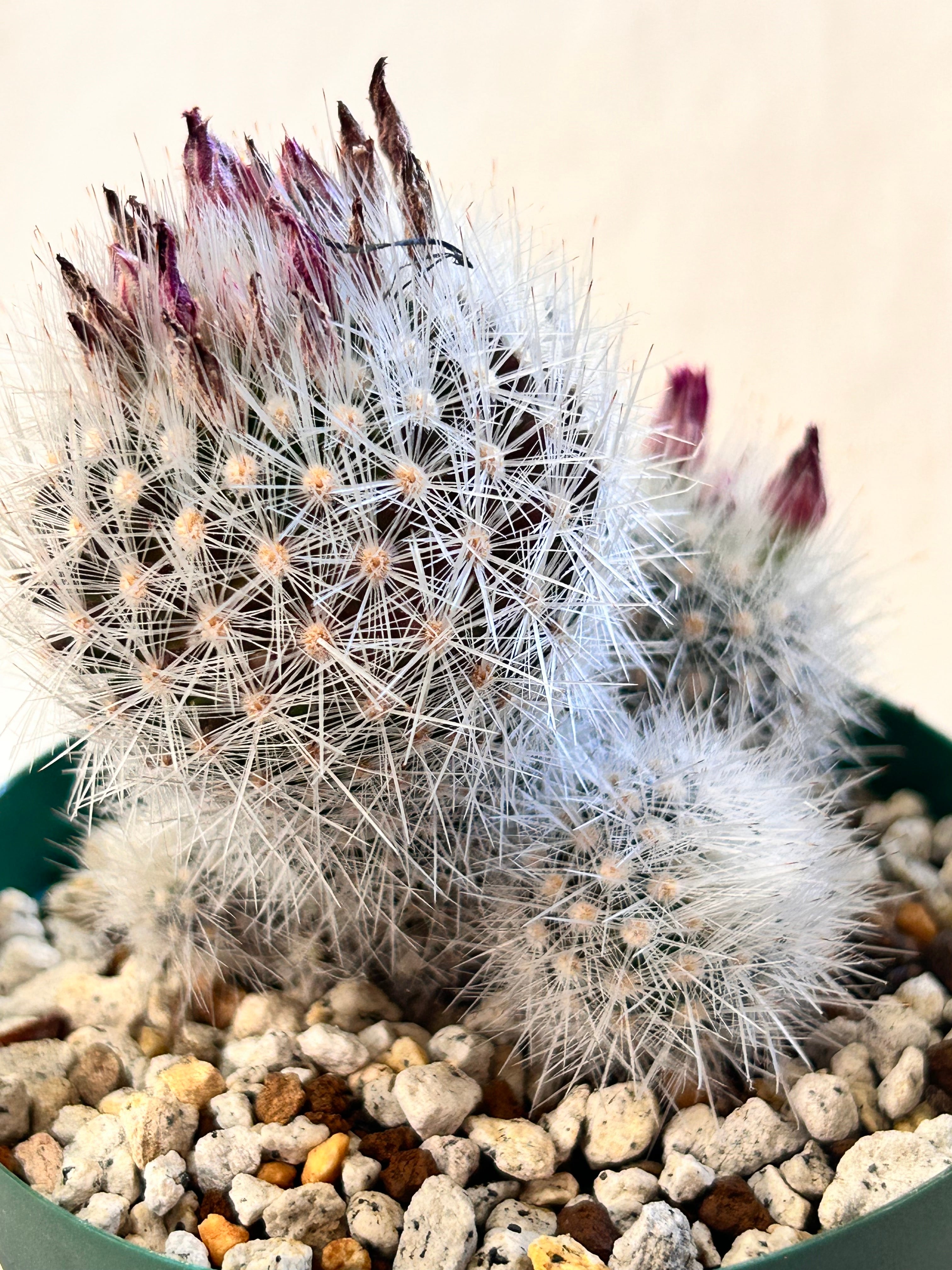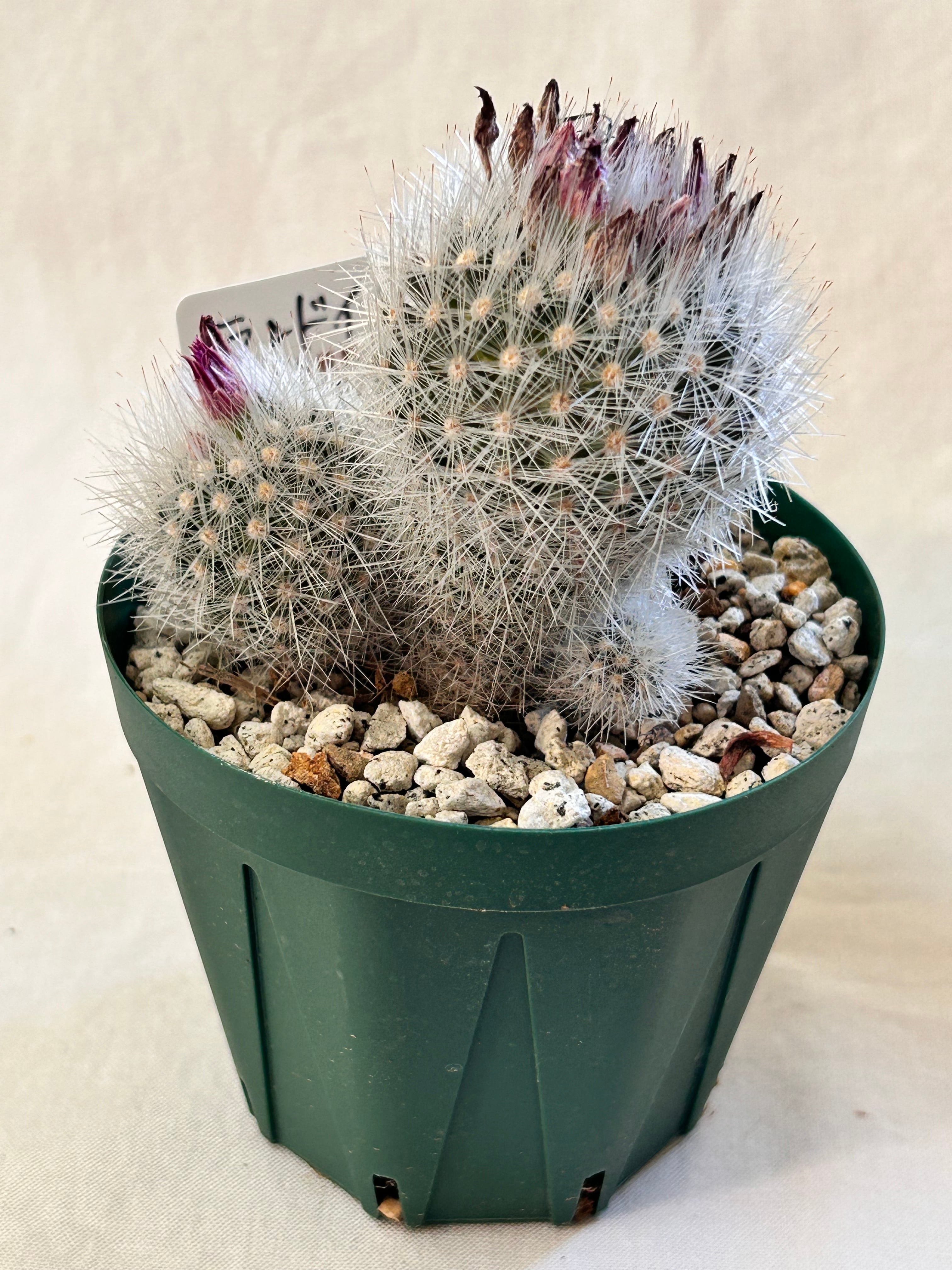 繊細な白刺が美しい小型のサボテンで、春にピンク色の愛らしい花を咲かせます。